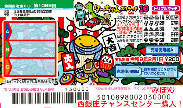 大好評!お申込みいただいた方全員に、東京・西銀座チャンスセンターで購入した「クーちゃんスクラッチ10 トリプルマッチ」をオマケとして(お試し10枚コースは1枚、20枚コース及びセットは2枚、30枚以上のコース及びセットは3枚)をそれぞれプレゼントいたします。