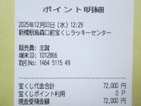 | スペシャル開運日の新橋烏森口ラッキーセンター1番窓口発行の明細。 |