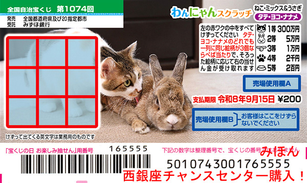 1等当選祈願!西銀座でわんにゃんスクラッチくじを購入いたしました! |