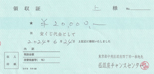 東京・西銀座チャンスセンターの領収証。第1011回全国自治宝くじワンピーススクラッチ「ルフィ13 ラッキーターゲット」6月24日大安吉日の購入。 |